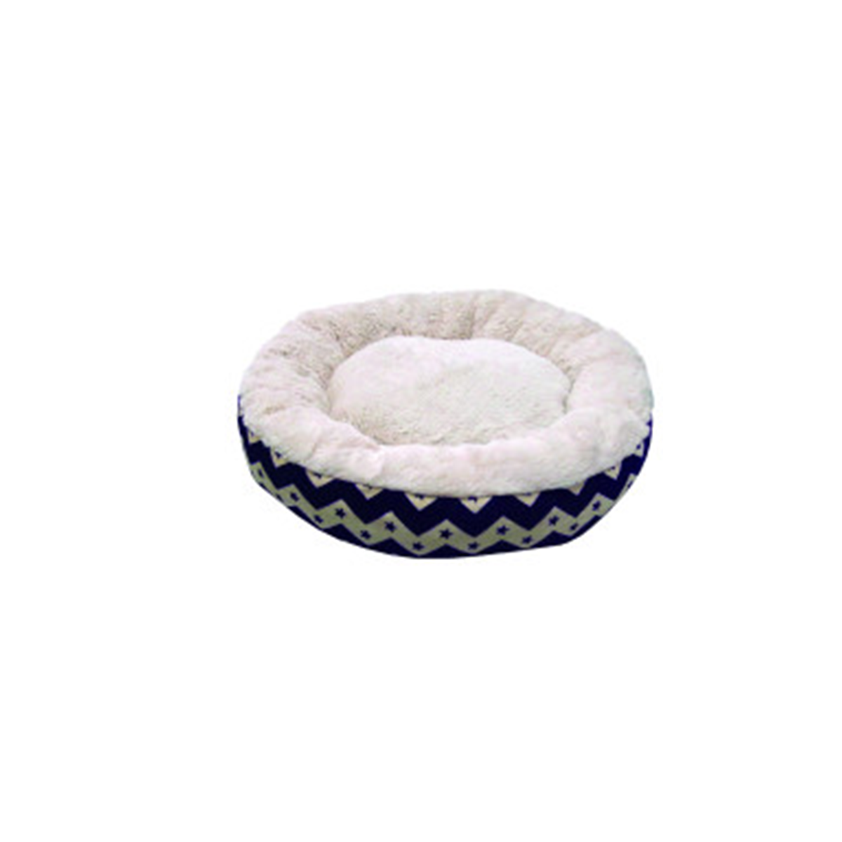 Округла текстилна лежалка за куче со дијаметар 50цм и висина 12цм. Надворешната страна на лежалката е шарена, додека внатрешноста на лежалката е крзнена
