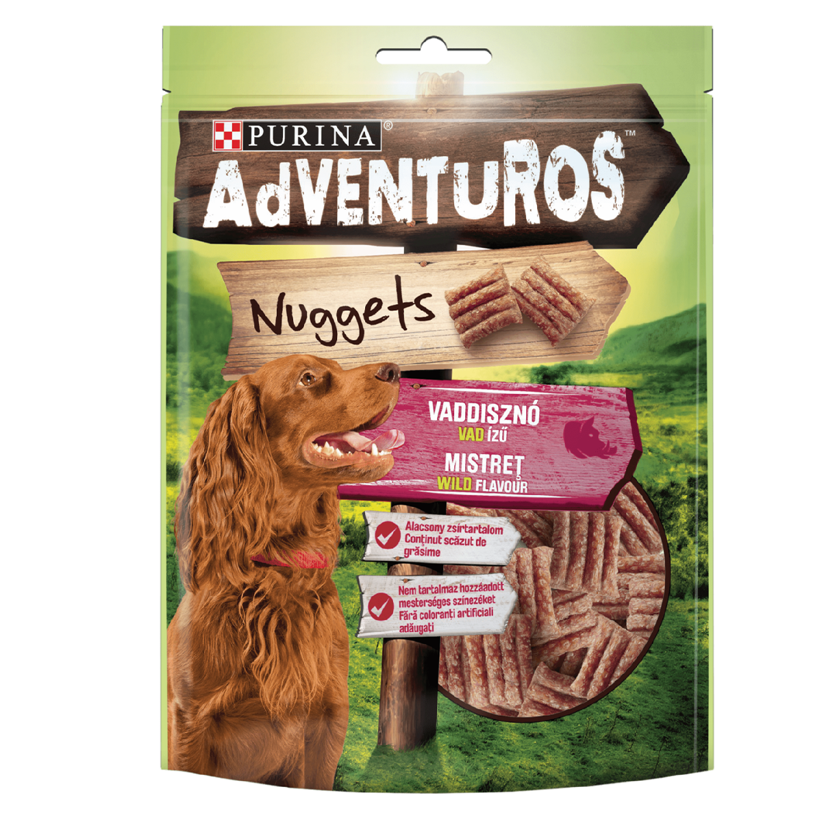 Purina Adventuros Nuggeds дополнителна храна за кучиња со арома на вепар.