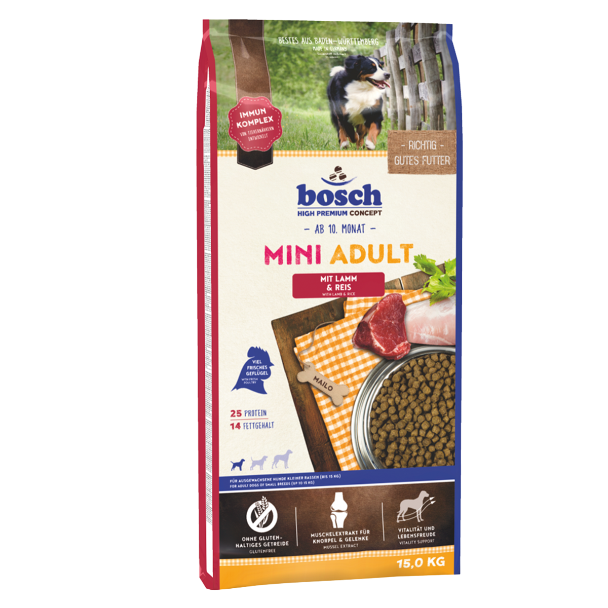 Bosch Mini Adult е храна наменета за кучиња од мали раси со нормална физичка активност или поактивни кучиња, исто така и за кучиња кој се попребирливи во поглед на исхраната.