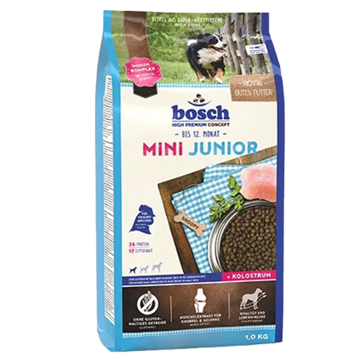 Bosch Мini Јunior е храна особено наменета за мали раси на кучиња под една година кои се чувствителни на храна. Големината на гранулатите, протеинскиот и минералниот состав специјално се прилагодени за кучиња од помали раси. Употребата на колострум го зајакнува имунолошкиот систем, како и специфичниот имунолошки комплекс на манани и глукани. Екстрактите од школки содржат поддршка на ‘рскавицата и развојот на зглобовите.