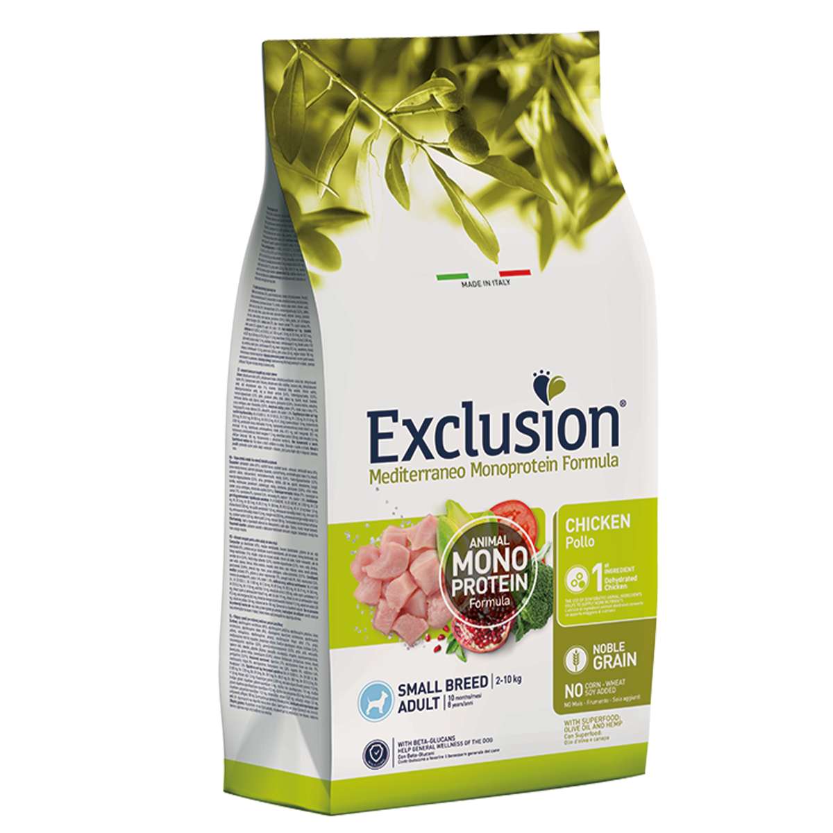 Целосна и избалансирана храна, формулирана со еден единствен извор на дехидриран животински протеин, со јасен и суштински рецепт и само едно висококвалитетно благородно зрно. Зачувана е со природни антиоксиданси и интегриран со бета-глукани. Збогатен е со иновативен рецепт на суперхрана од медитеранската традиција: коноп, маслиново масло, домат, калинка, брокула и цикорија. Без додадена пилешка маст, пченица, соја и пченка