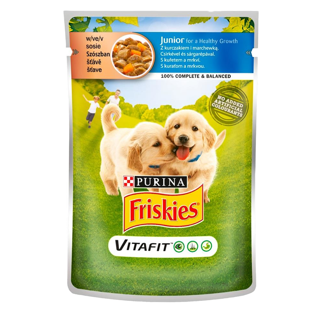 Friskies Junior Dog е течна храна за кучиња под 12 месеци на база на пилешко и зеленчук.