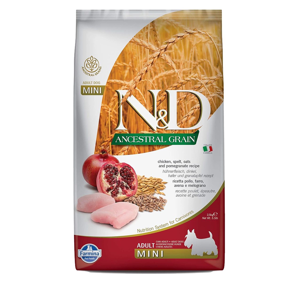 N&D ANCESTRAL GRAIN е од италијанската кулинарска традиција и користи неколку, едноставни и оригинални состојки за да му понуди на вашето домашно милениче урамнотежена, комплетна исхрана со житарки со низок гликемиски индекс. 90% протеини од животинско потекло, 0% вештачки конзерванси, 0% пченка .
