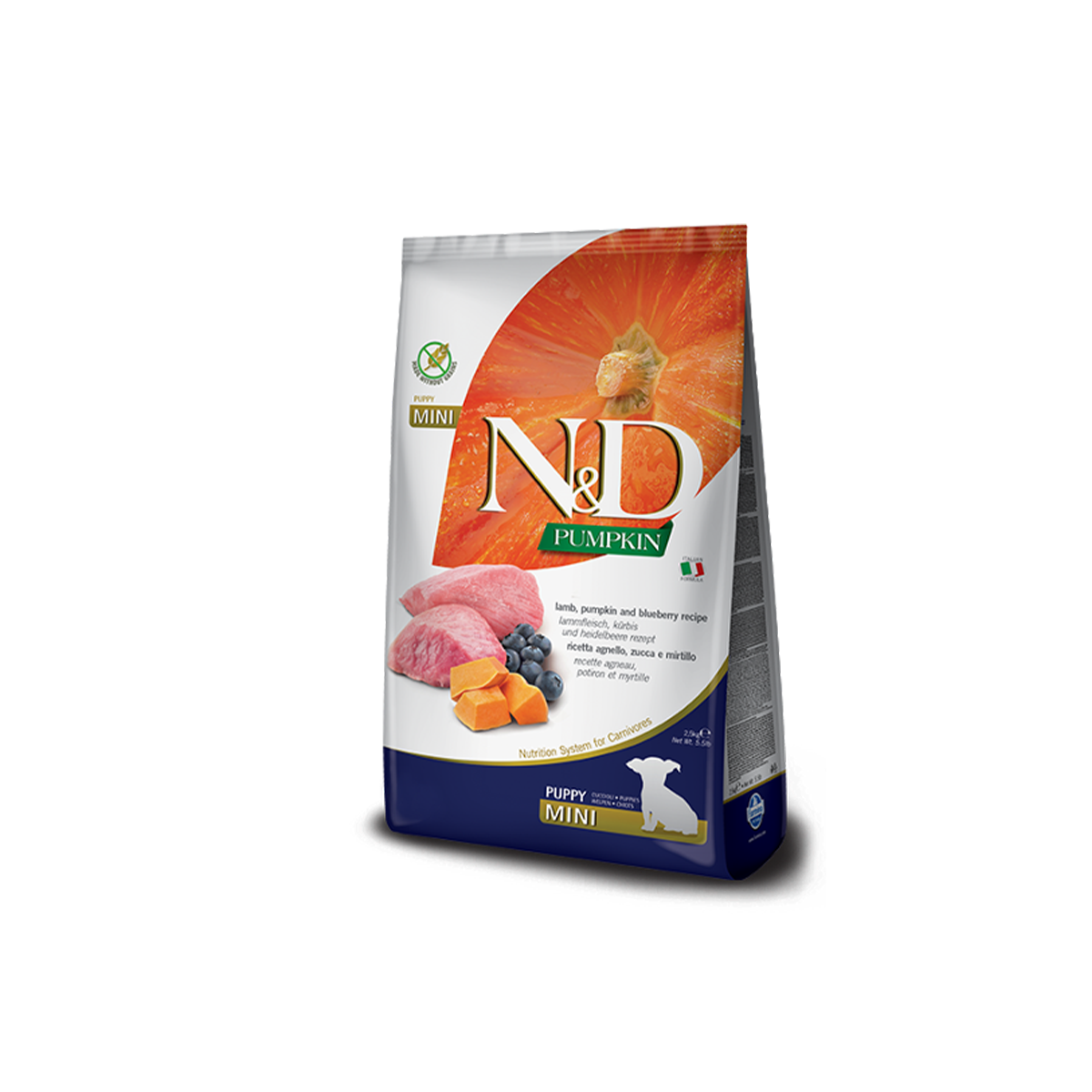 N&D Mini Puppy е храна за мали раси на кучиња под годинка на база на јагнешко, тиква и боровинка. Рецептот е од јагнешко, тиква и боровинки и е формулиран за да ги задоволи нутритивните нивоа утврдени со Профилите на хранливи материи за храна за кучиња AAFCO за сите животни фази, вклучувајќи го растот на кучиња со големи димензии (70 lb. или повеќе како возрасен).