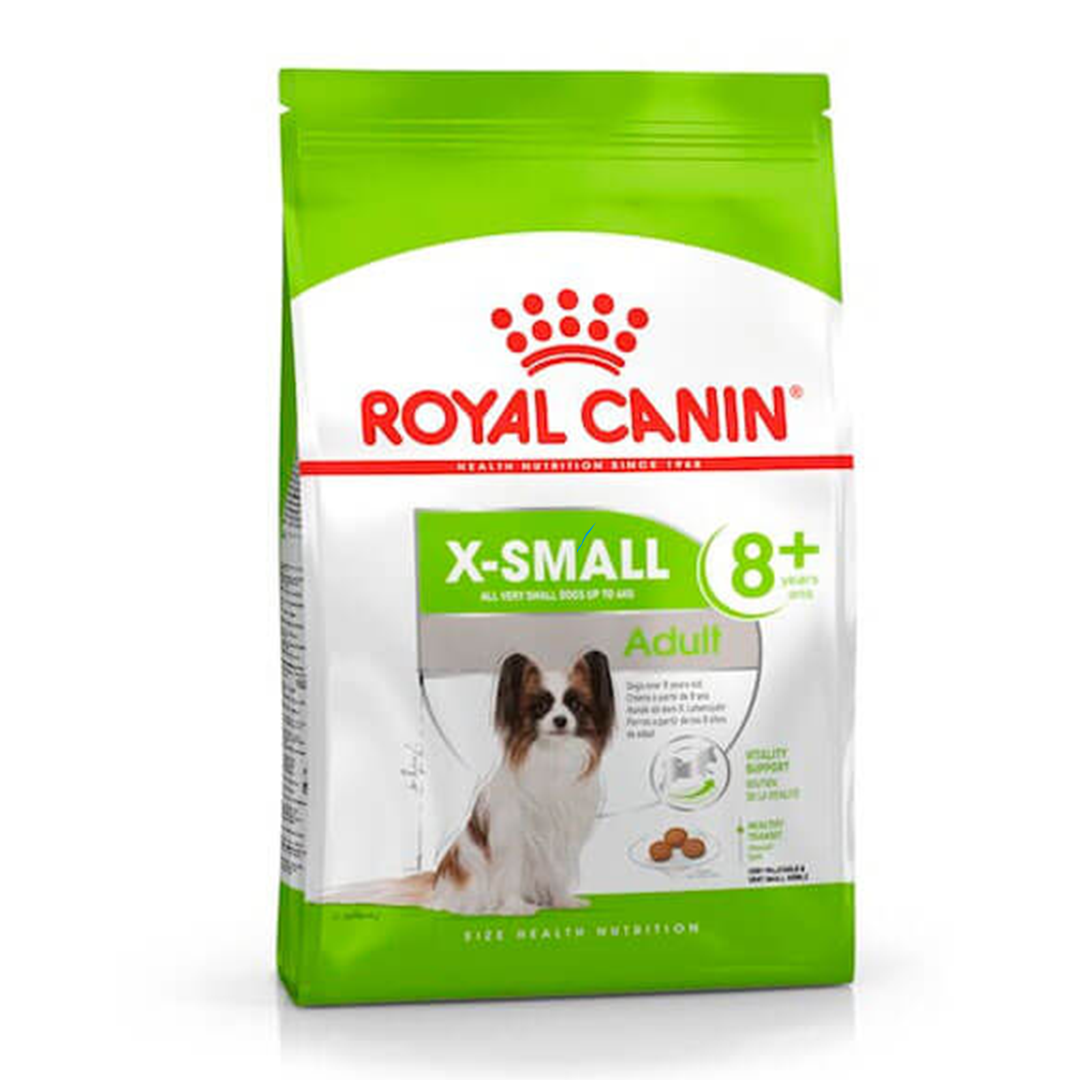 ROYAL CANIN® X-Small Adults 8+® е производ специјално дизајниран да ги задоволи потребите на кучиња од мали раси со тежина помала од 4 кг кога ќе влезат во зрелоста и ќе почнат да ги покажуваат своите први знаци на стареење благодарение на големината на зрната. Тие обезбедуваат олеснување на нивните вилици и дигестивен систем, за кои мора правилно да се грижите со специјализирана исхрана со обезбедување хранливи материи и витамини кои заедно ги неутрализираат првите знаци на стареење како што се запек, проблеми со бубрезите, проблеми со зглобовите итн., кои почнуваат да стануваат поочигледни од оваа фаза.