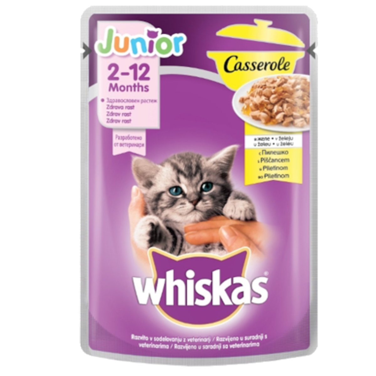 Whiskas Junior Casserole е комплетно избалансирана течна храна за мачиња под 12 месеци на база на пилешко.